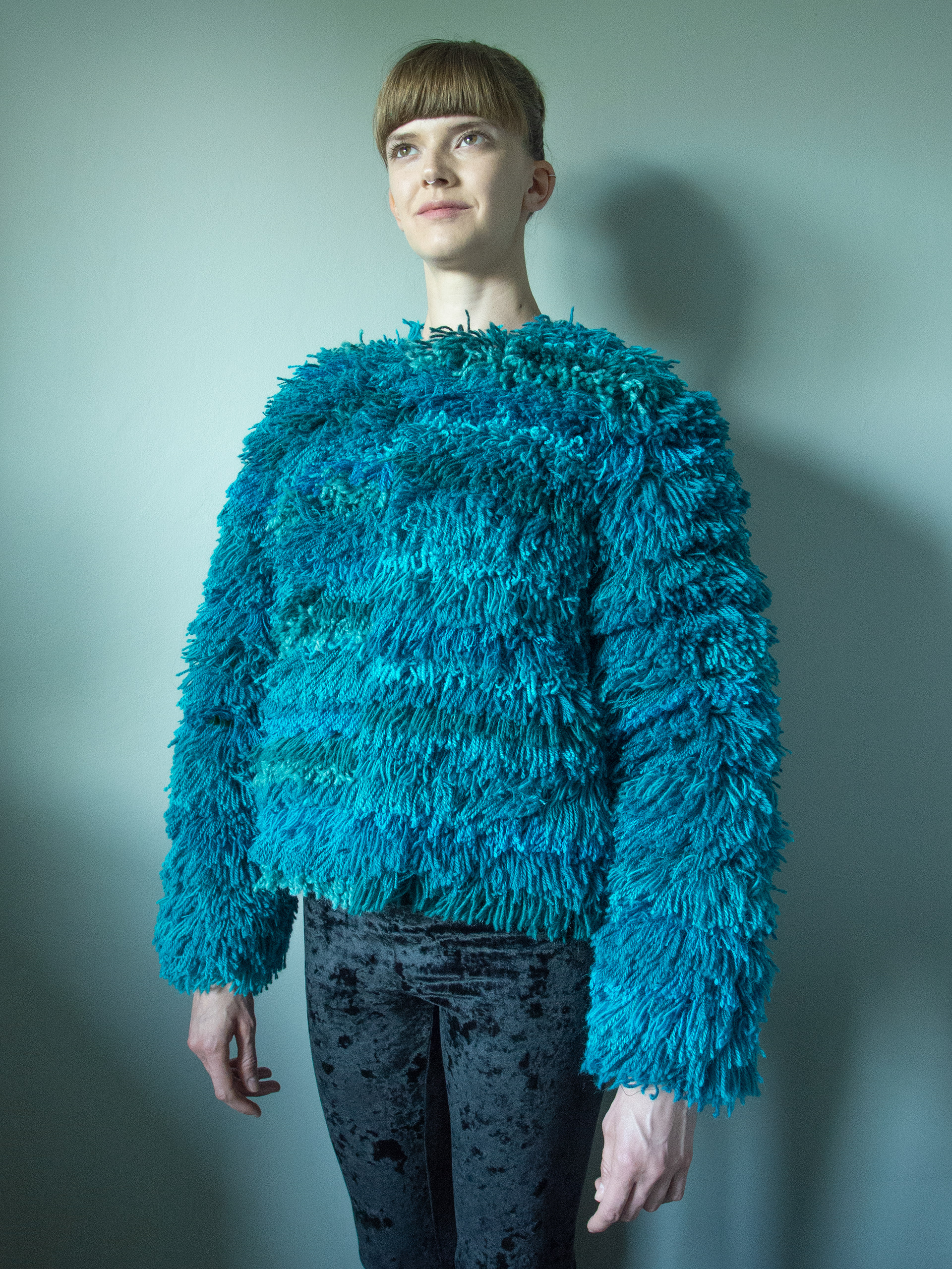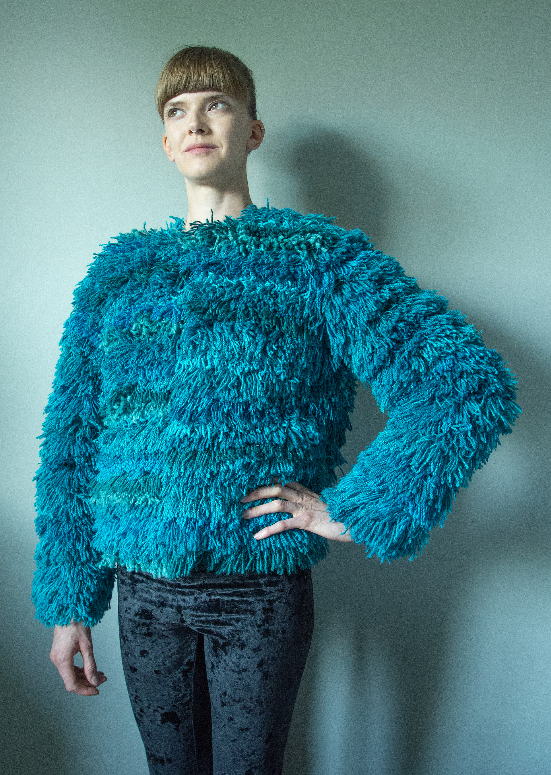Inspired by a large box of leftover yarns I had the idea to make a fluffy fur coat.