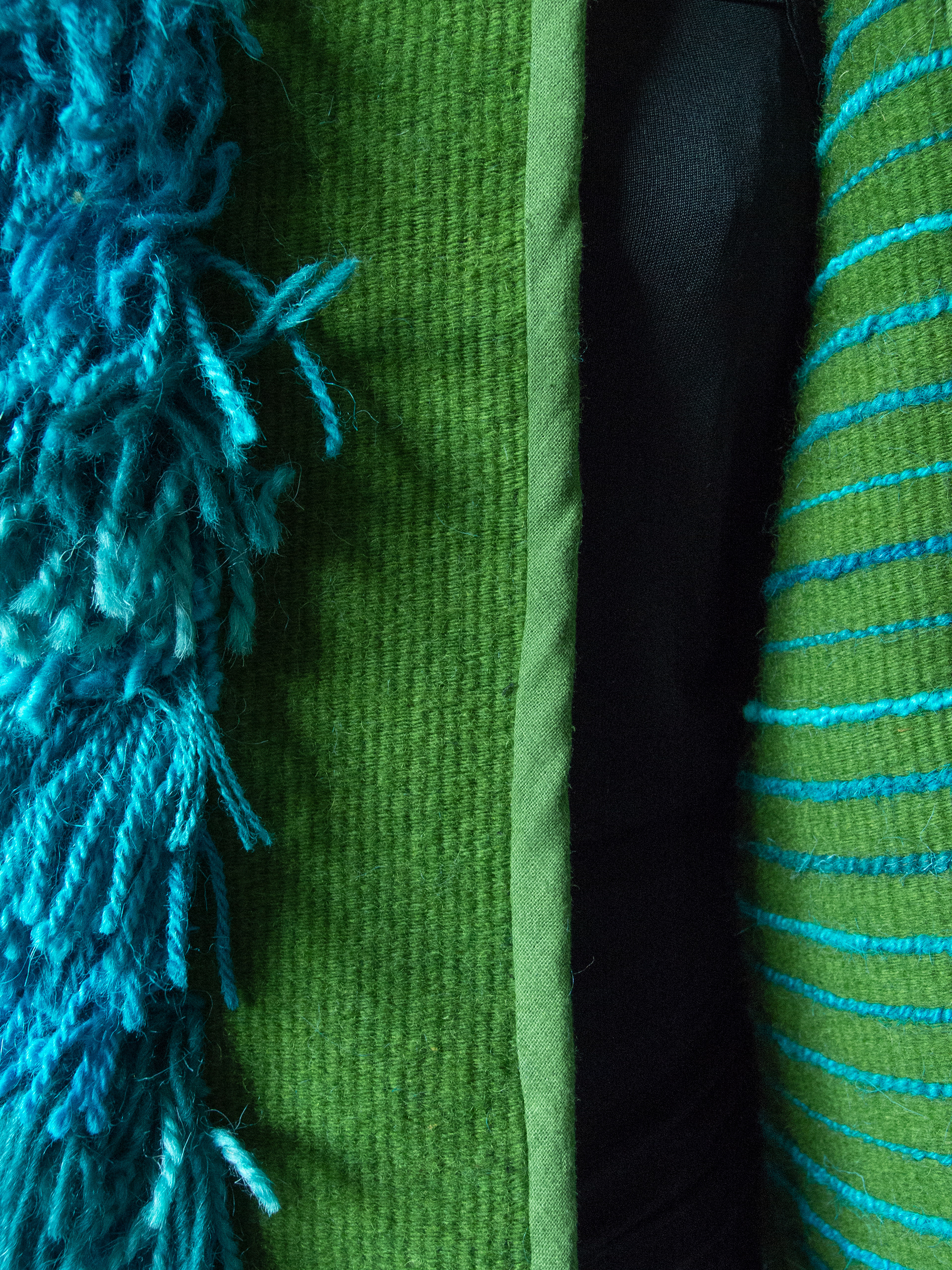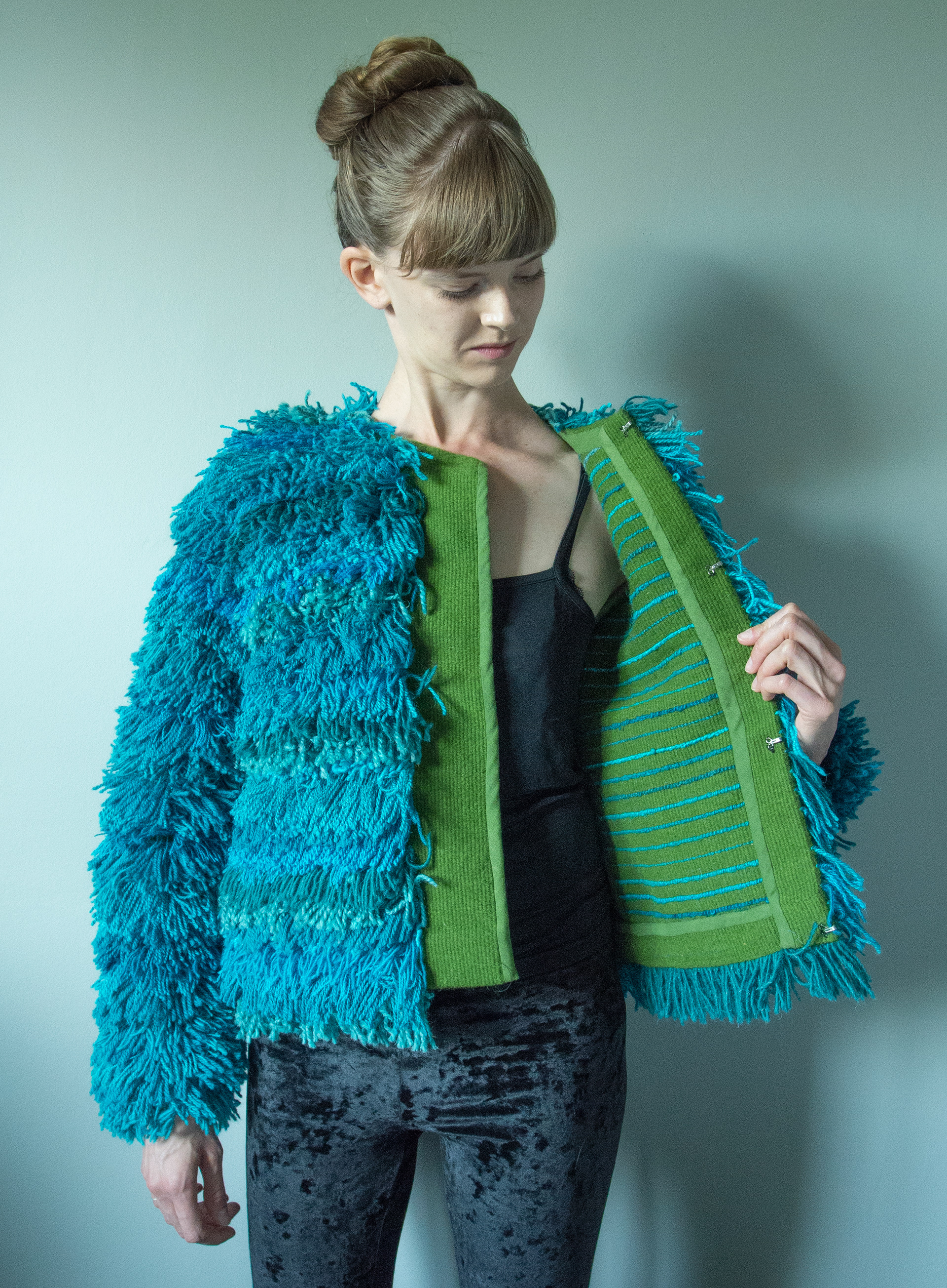 Hand woven jacket made from upcycled yarns of mixed qualities (mostly wool).